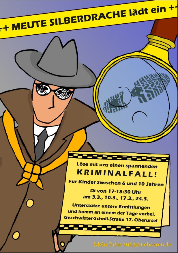 Los geht’s am 03.03. von 17:00-18:30 Uhr. Der Fall soll an den darauffolgenden Dienstagen (10.03., 17.03. und dem 24.03., jeweils zur gleichen Uhrzeit) gelöst werden. Ein Einstieg ist jederzeit möglich und es ist keine Anmeldung nötig. Die Treffen finden im Stammesheim (Geschwister-Scholl-Str. 17 in Oberursel) statt.